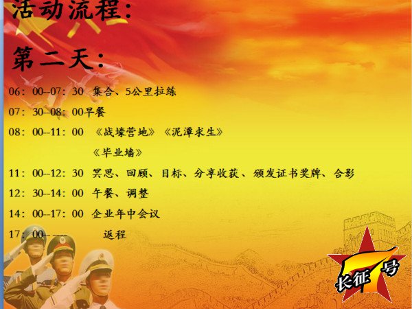 戰(zhàn)狼魔鬼訓練營推薦理由:在海爾以為臨時銷售人員都要經過3個月的培訓和4次考評后才能上“戰(zhàn)場",在華為銷售人員要經過魔鬼式訓練層層選拔銷售是企業(yè)的生命線,提高銷售人員的市場生存能力為銷售團隊組織有針對性,有實戰(zhàn)性的培訓,已成為公司的重要工作之一,武漢長征七號戰(zhàn)狼特訓營打造“魔鬼軍事拓展營”從心態(tài)到實戰(zhàn),提升銷售人員的綜合素質和抗壓力,為企業(yè)打造銷售戰(zhàn)場上的“特種兵”。